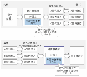 図1のように、内外では「日本の出願人が海外へ特許を申請する」ことを日本の特許事務所が仲介する形なのに対して、外内では「海外の出願人が日本へ特許を申請する」ことを仲介します。